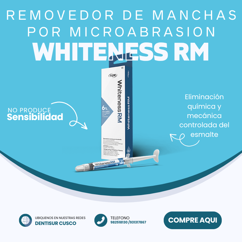 Whiteness RM de FGM es un gel de microabrasión a base de ácido clorhídrico al 6% y carburo de silicio, diseñado para eliminar manchas superficiales (fluorosis, hipoplasia, manchas blancas) mediante acción químico-mecánica. Es seguro, no causa sensibilidad, se aplica fácilmente y logra resultados definitivos en una sola sesión.